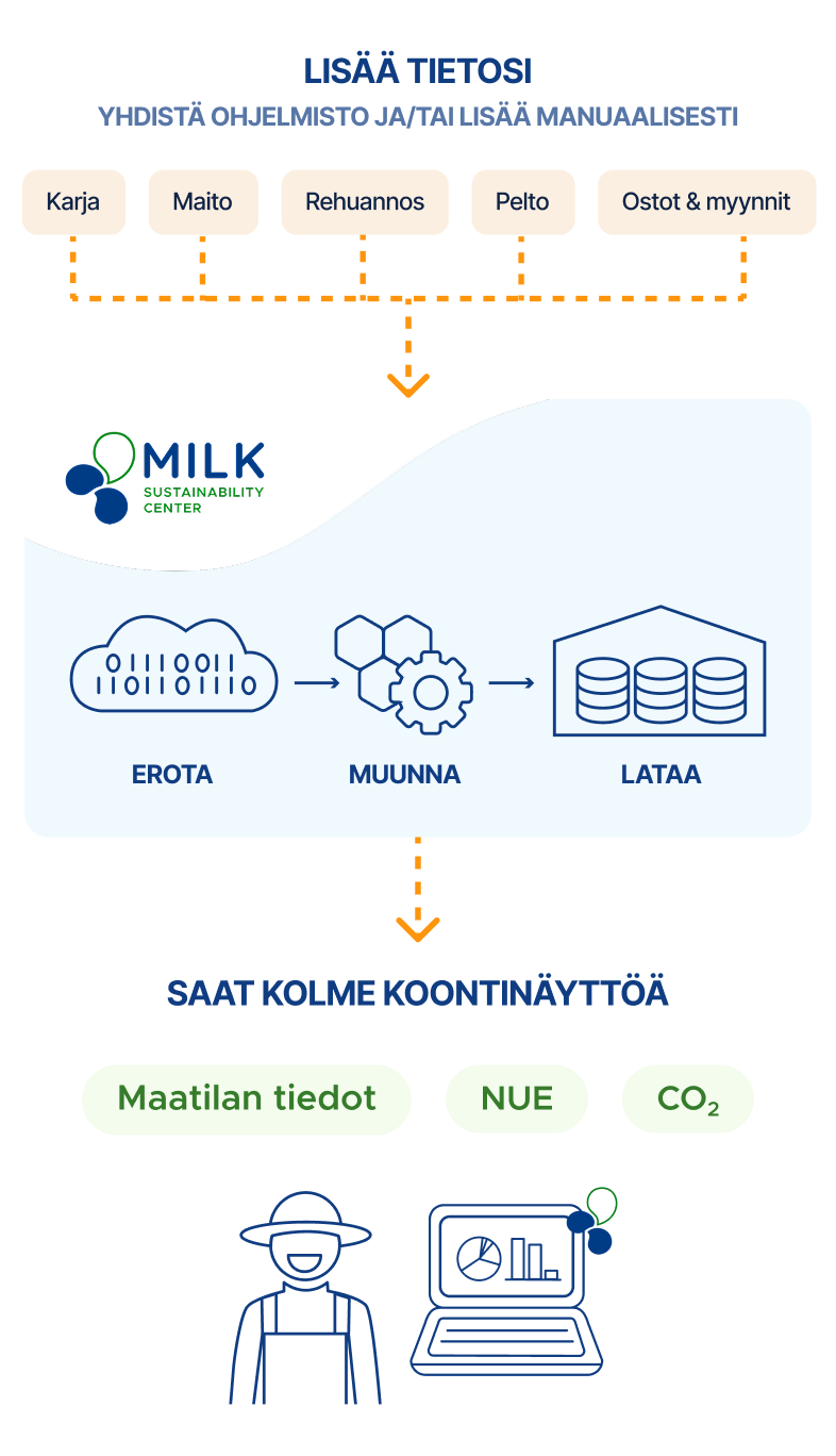MSC auttaa sinua seuraamaan maatilasi kestävyyttä analysoimalla tietoja viideltä avainalueelta: karja, maito, annos, pelto sekä ostot ja myynti. Nämä tiedot voivat olla peräisin maatilaohjelmistostasi, syöttämällä ne manuaalisesti tai molempien yhdistelmänä. Mitä enemmän dataa annat, sitä syvempiä oivalluksiasi on.